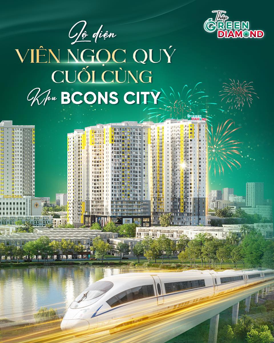 Bcons City – Green Diamond: là khu phức hợp căn hộ kết hợp tiện ích cao cấp trên đường Thống Nhất, Thành phố Dĩ An (nay là Phường Đông Hoà, Thành phố Hồ Chí Minh) do Tập đoàn Bcons làm chủ đầu tư. Dự án chung cư Bcons City có quy mô gần 5ha, cung cấp 3900 căn hộ, nhà phố kết hợp hệ tiện ích cao cấp nhất khu vực gồm trường quốc tế, trung tâm thương mại, nhà hàng khách sạn 4 sao,…. Vị thế đắc địa chỉ cách tuyến Metro 5 phút xe đạp, do đó dự án đang là lựa chọn an cư tốt nhất cho khách hàng đang làm việc tại TP.HCM.