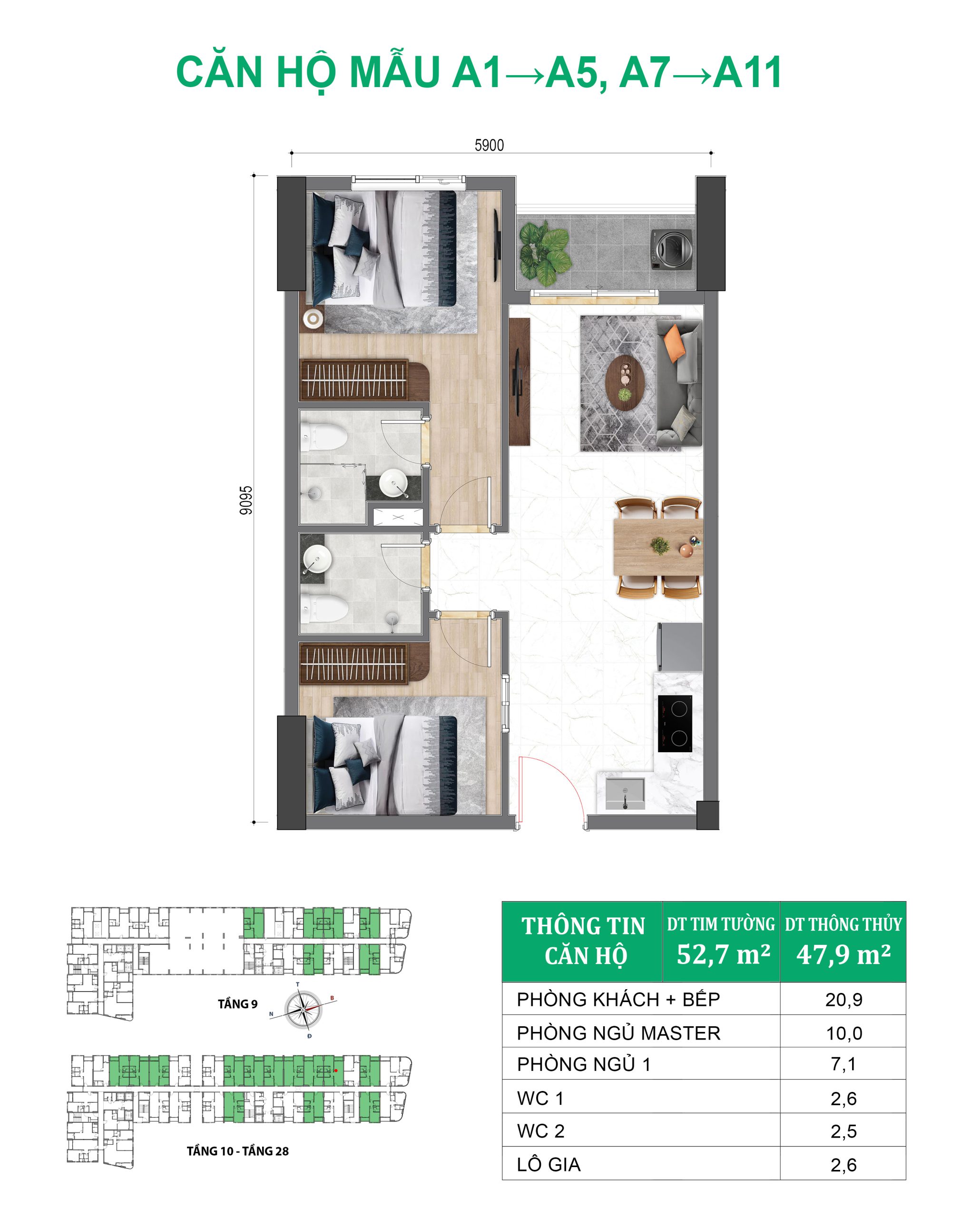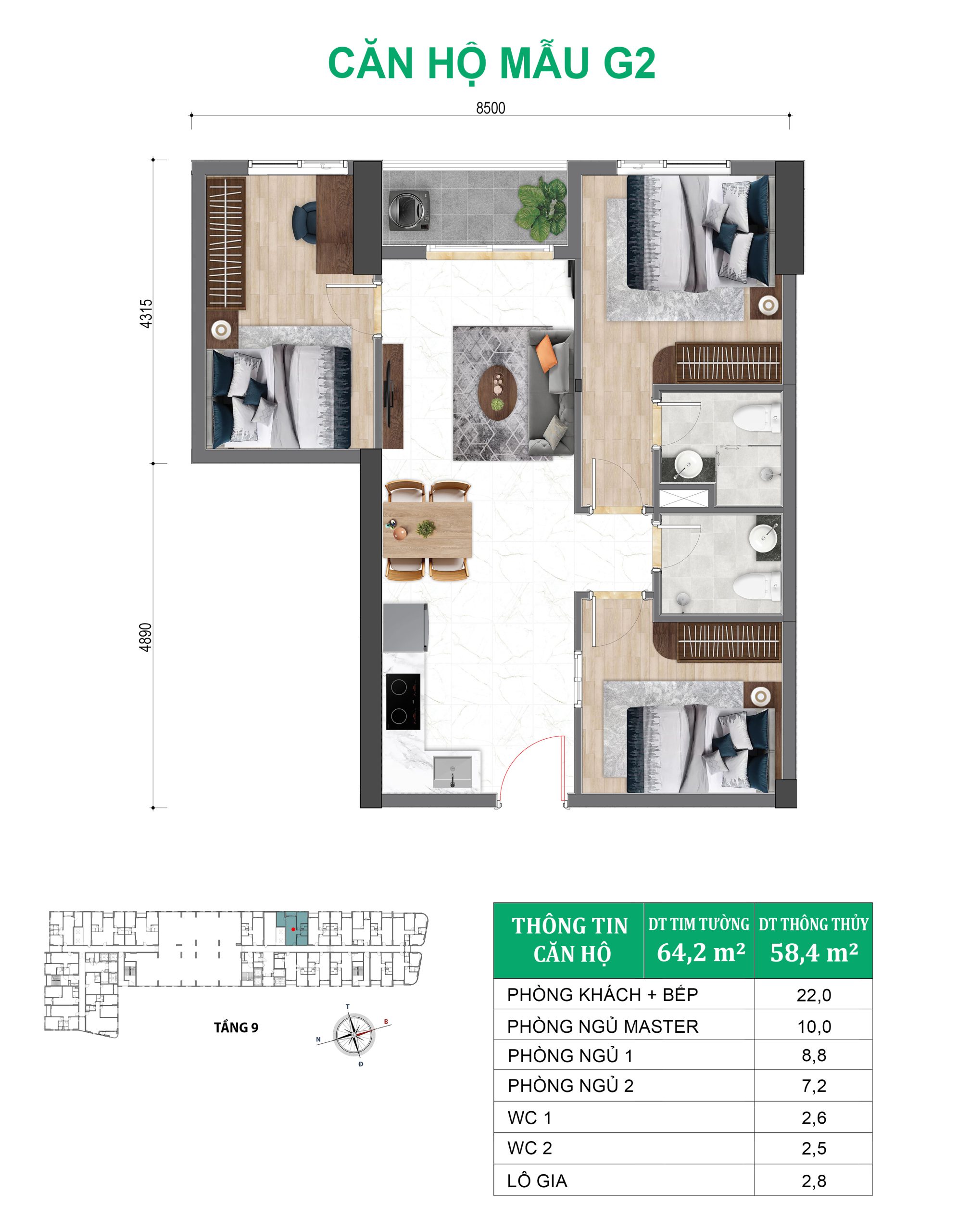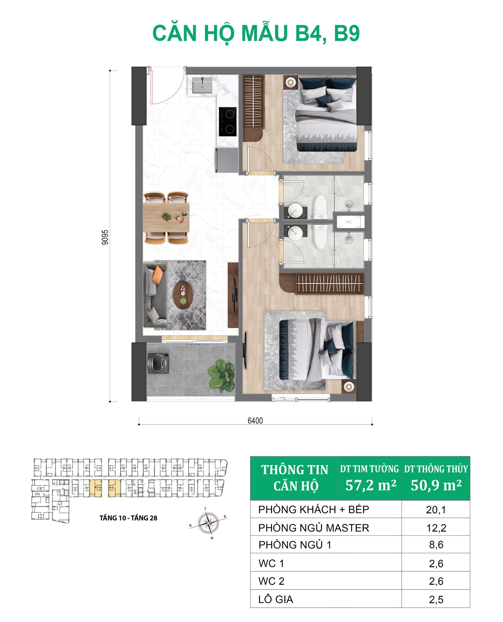 Căn hộ 2 phòng ngủ diện tích từ 52 - 59m2 |