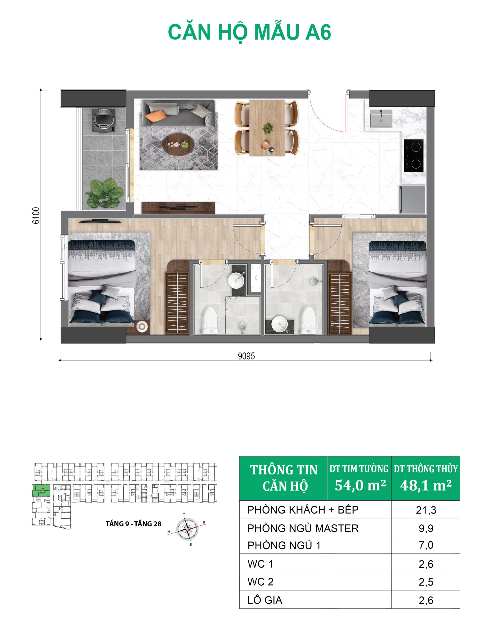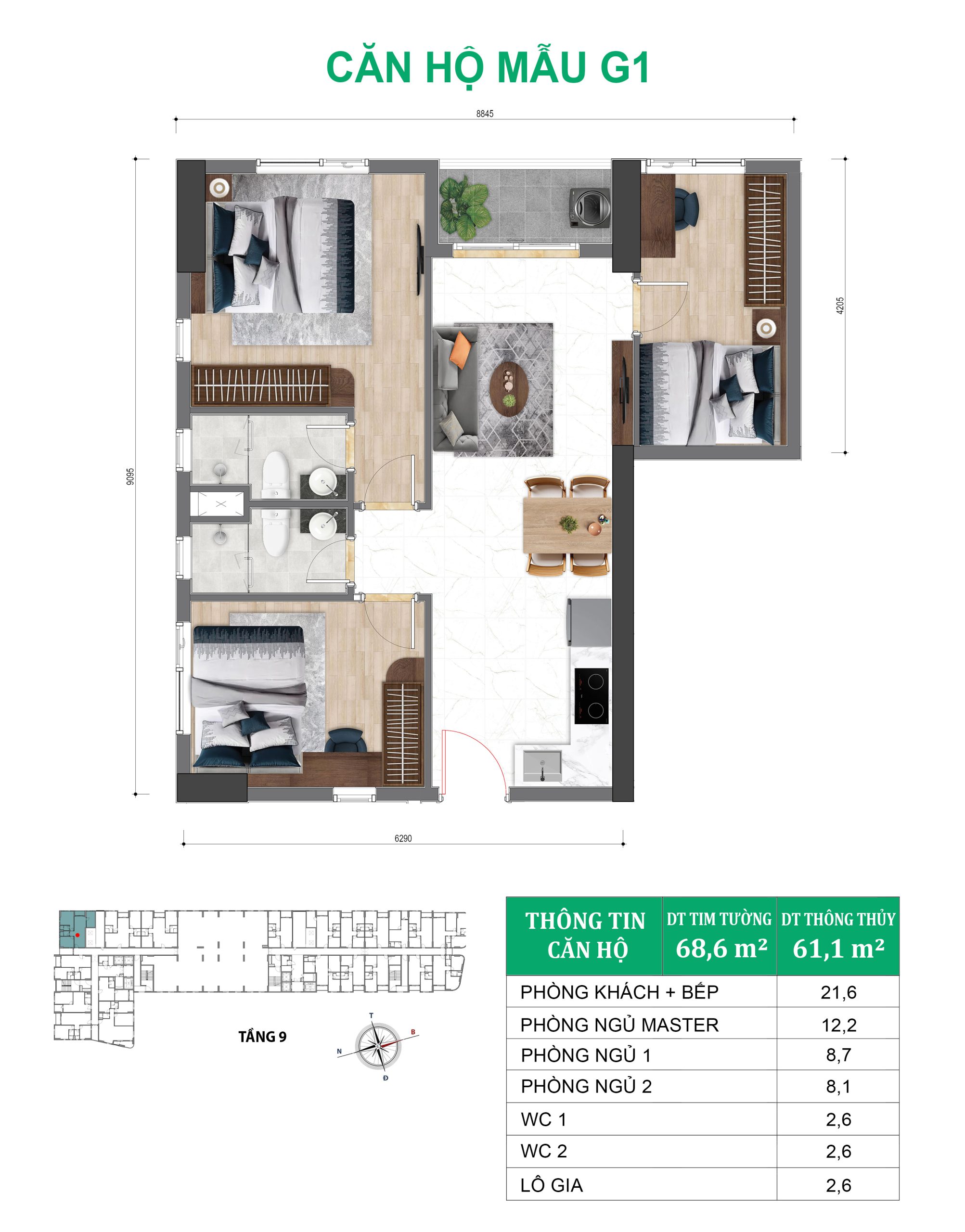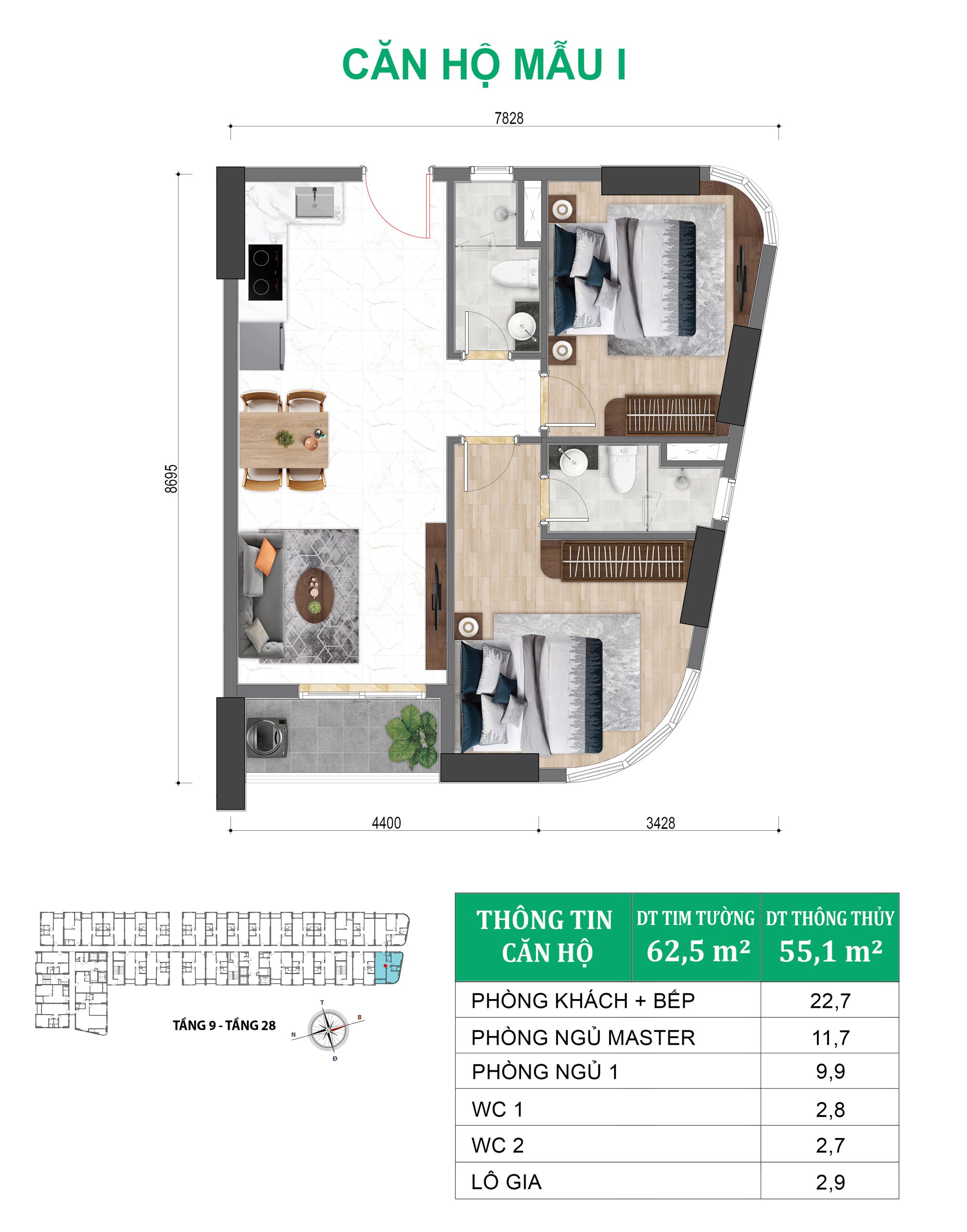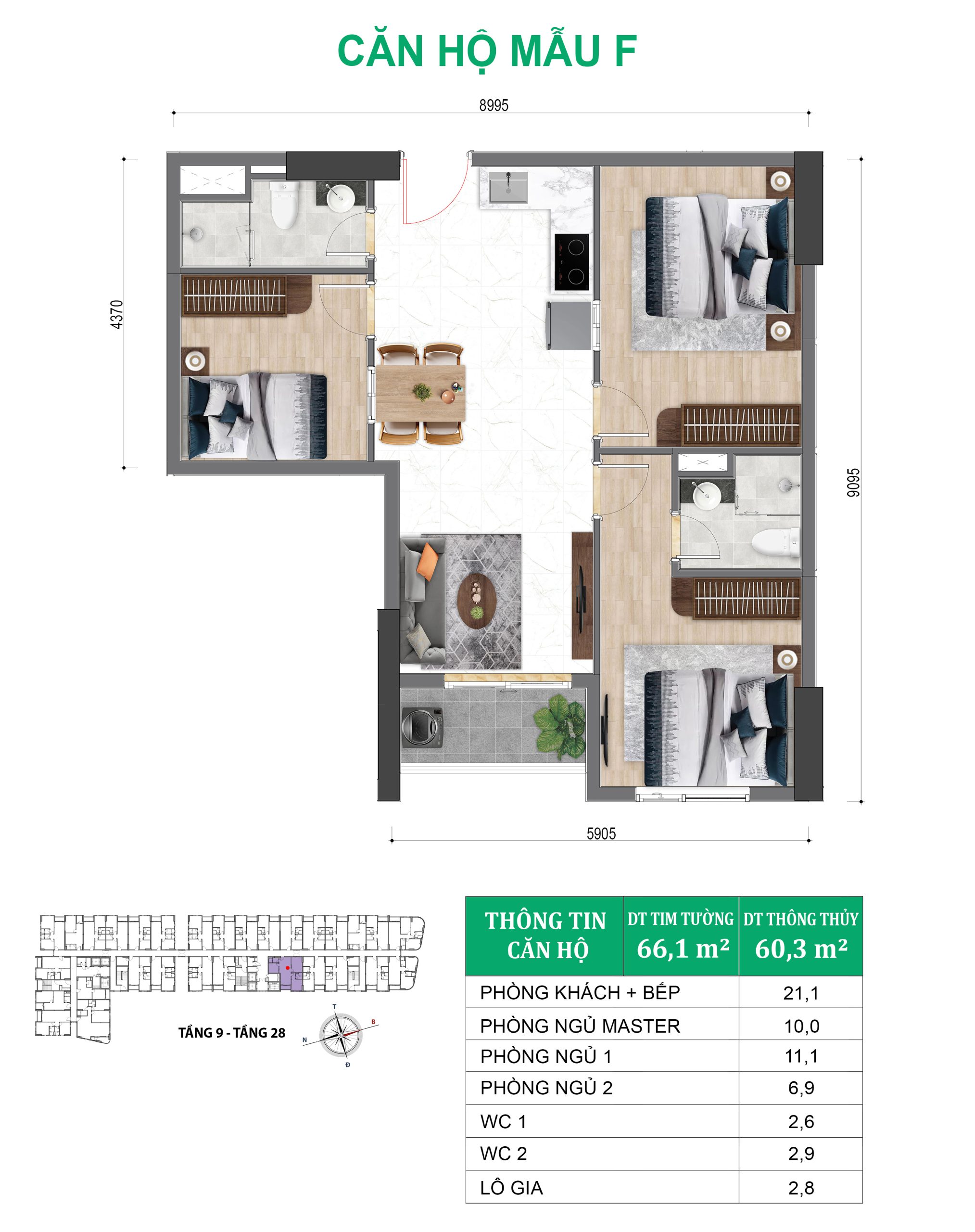 Căn hộ 3 phòng ngủ diện tích từ 60 - 95m2 |
