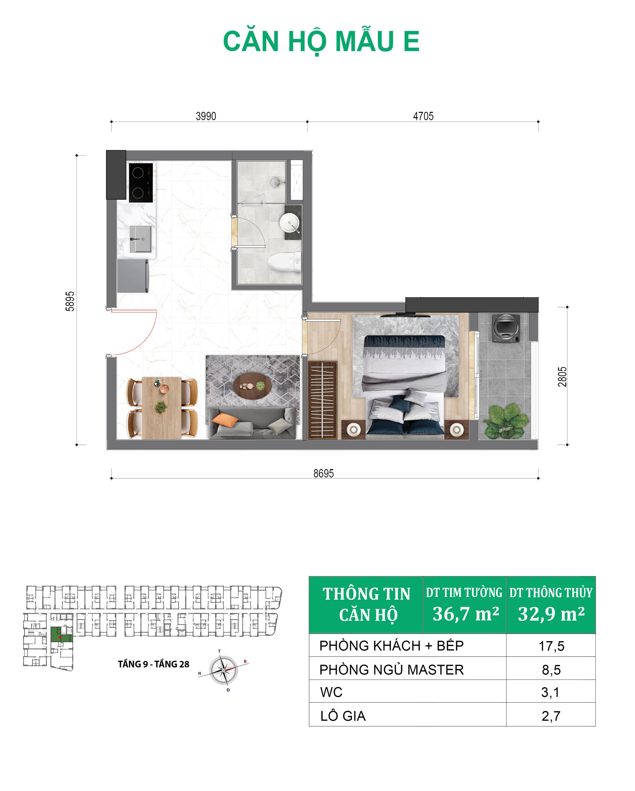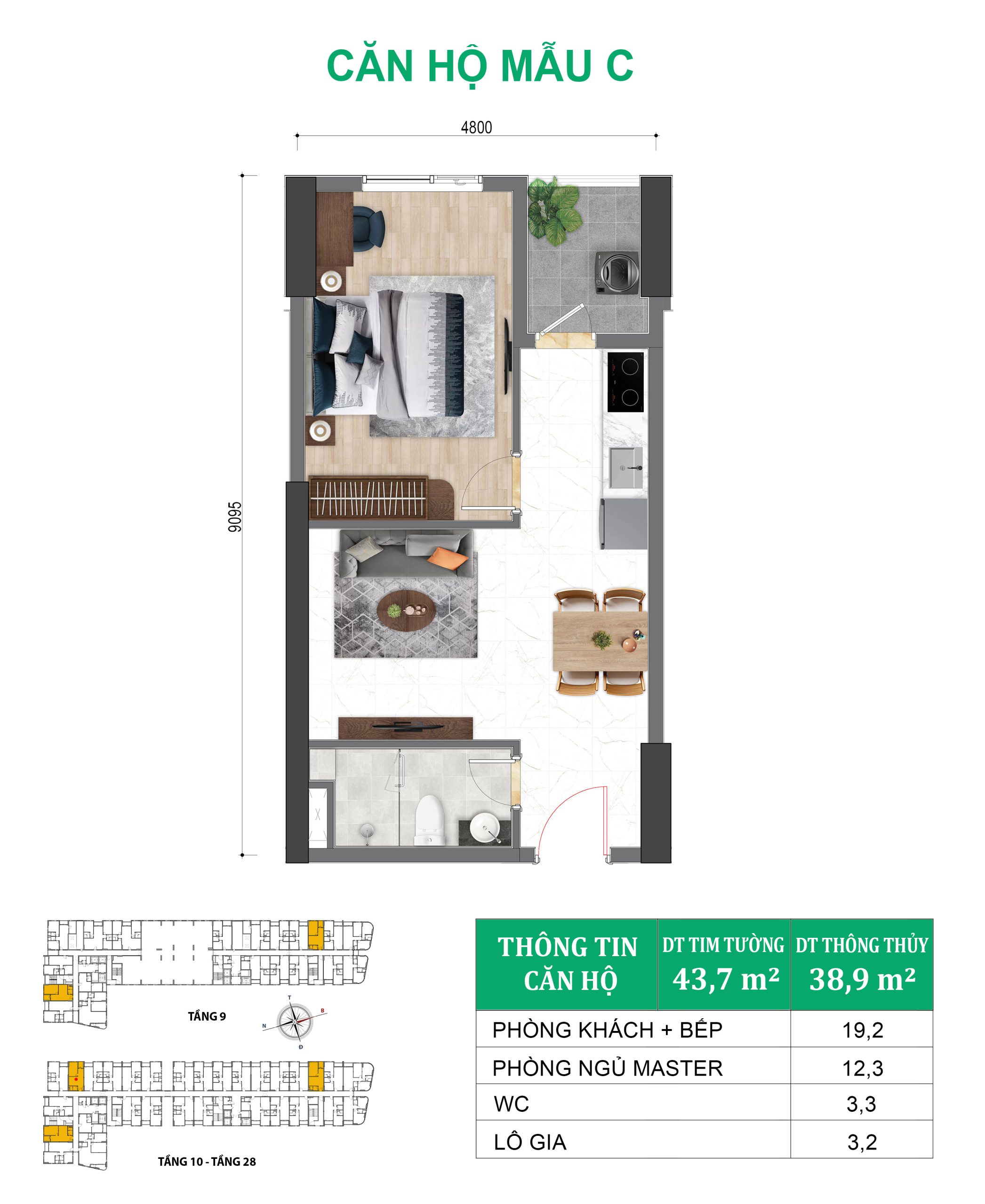Căn hộ 1 phòng ngủ diện tích từ 33 - 40m2 |