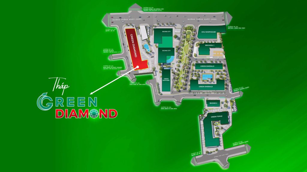 Dự án Bcons City – Green Diamond nằm trên đường Thống Nhất, phường Đông Hoà, TP. Hồ Chí Minh. Hiện đang là tâm điểm quan tâm của các gia đình trẻ và nhà đầu tư.